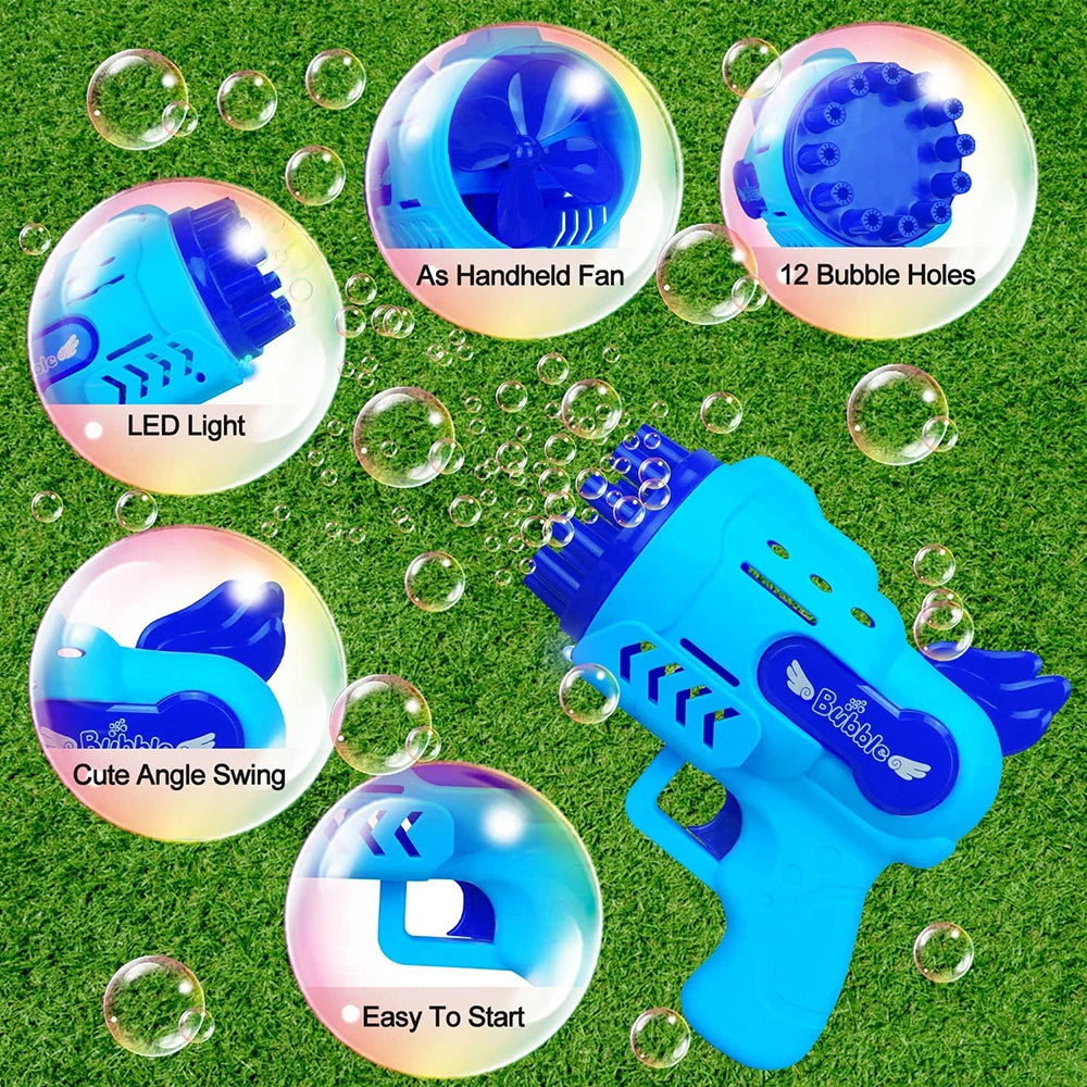 Additionally, it can function as a mini fan to provide a cool and comfortable breeze when your child feels tired. The fully automatic lighting is vivid and attractive, while the 360° swing design prevents water leakage. Perfect for use as a birthday gift, party toy, or even as a wedding or photography prop. Order now and let the bubble fun begin!