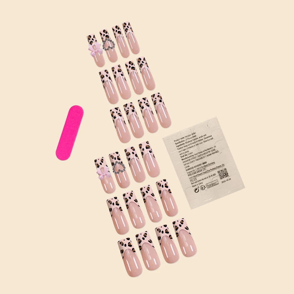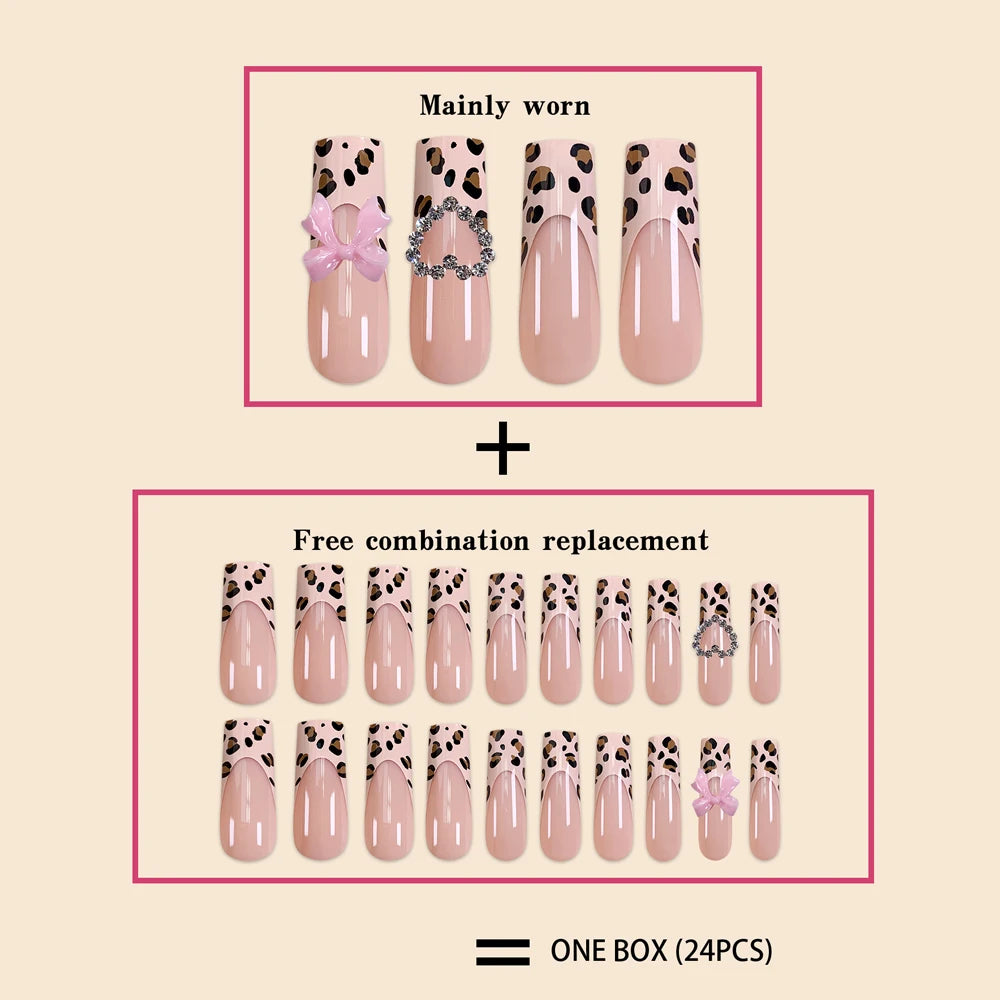 Indulge in the perfect blend of elegance and trendiness with our Luxury Ladies Super Long Square French Leopard Print Pink Bow Heart Decoration Fake Nails. This exquisite set of 24 pieces is designed for the modern woman who loves to make a statement with her nails.