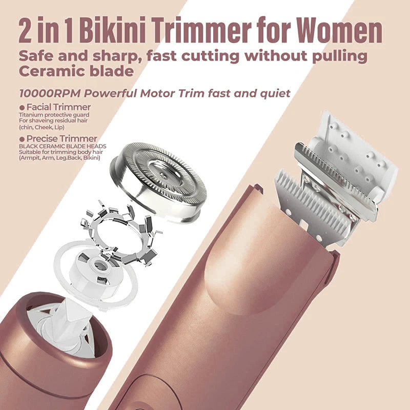 The Bikini Trimmer for Women is a specially designed 2-in-1 electric shaver for gentle, precise body hair removal. With its dual-head design, it safely removes hair from sensitive areas like the bikini line, underarms, face, and legs — giving you smooth skin without cuts, irritation, or pain.