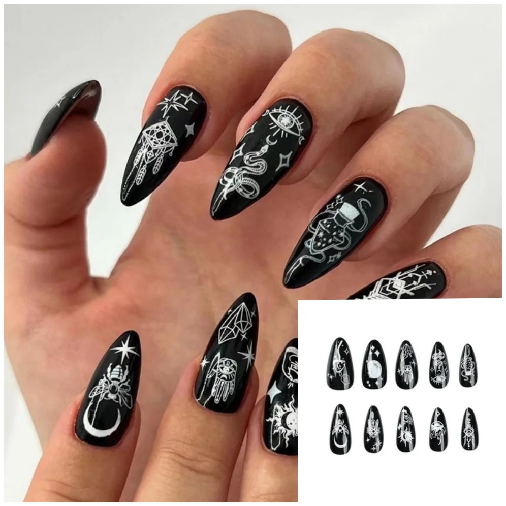 Transform your manicure routine with our stunning 24P Black Detachable Almond French Full Cover False Nails, featuring exquisite silver butterfly lines. These stiletto fake nails are designed to give you a salon-quality look right at home.